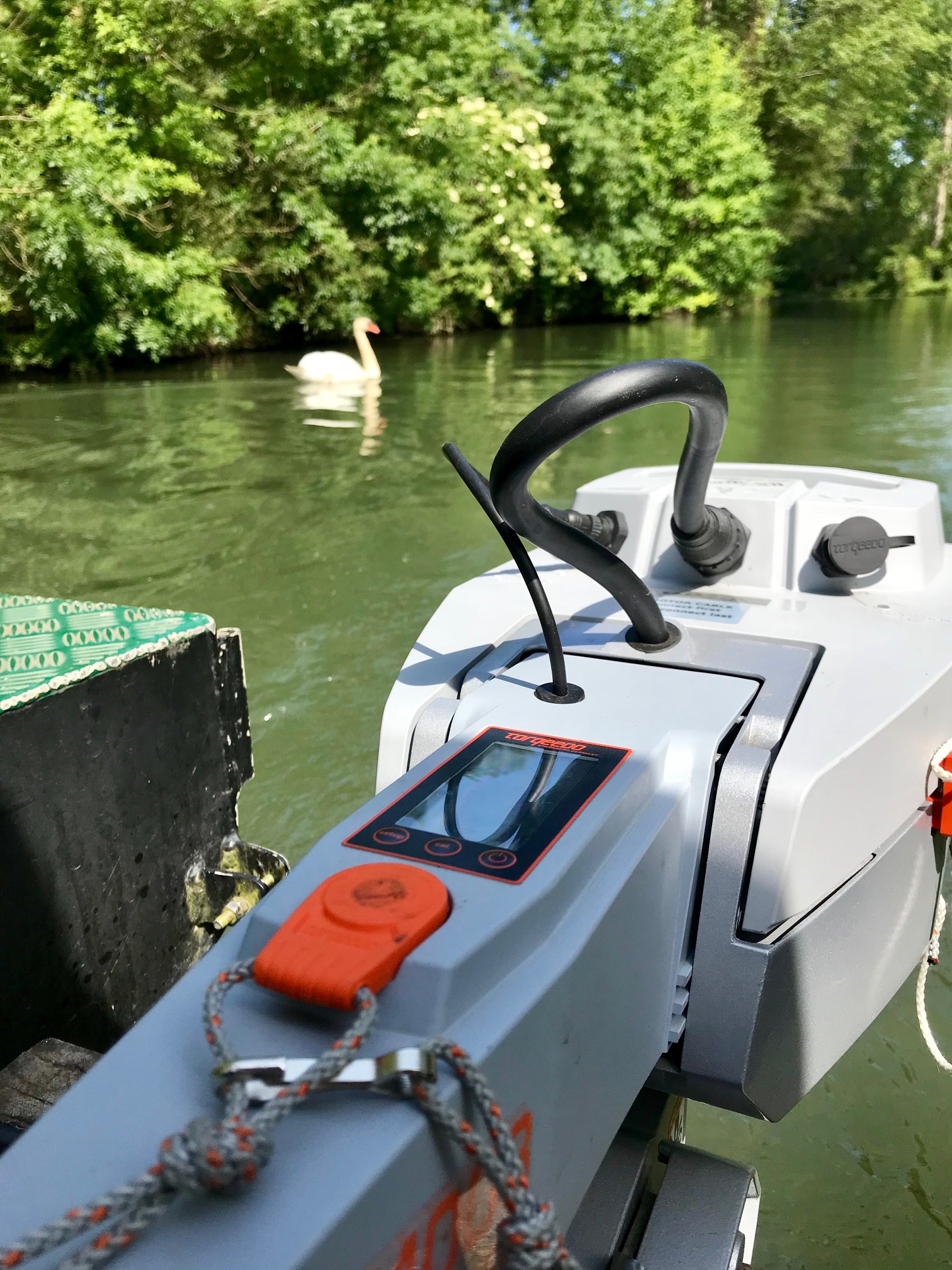 La batterie intégrée est un confort pour le batelier. Il part en promenade avec une batterie totalement chargée mais il dispose d’une seconde batterie pour le cas ou les conditions de navigation nécessiteraient d’utiliser plus de puissance.